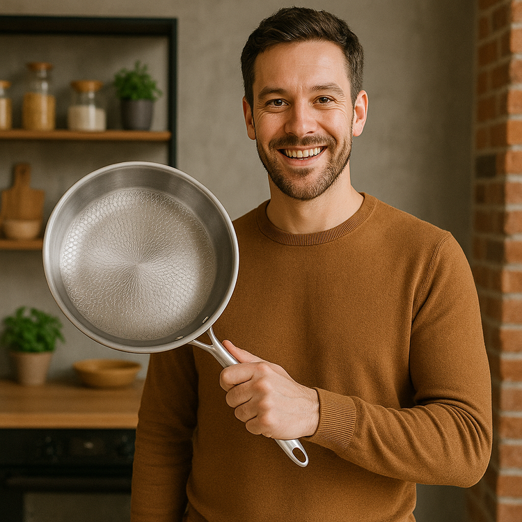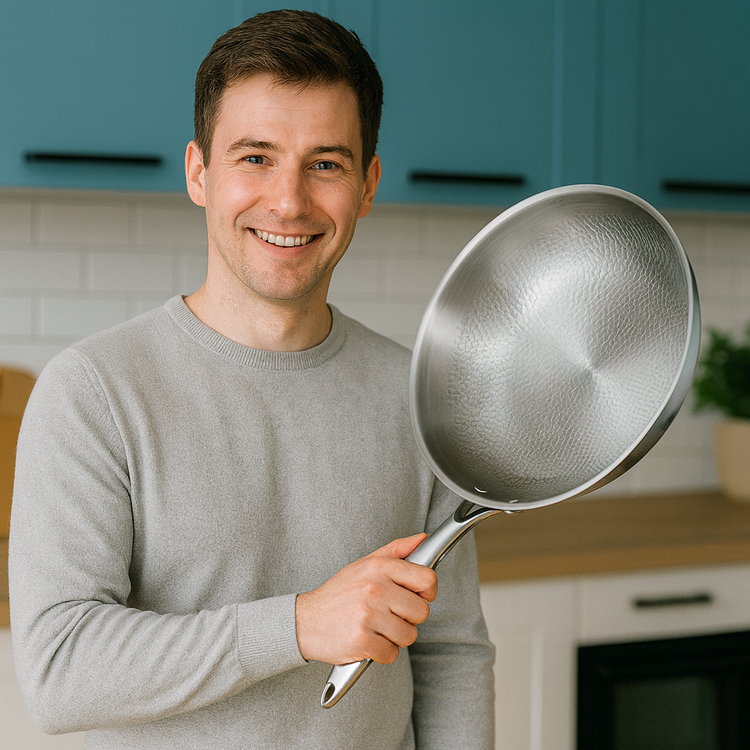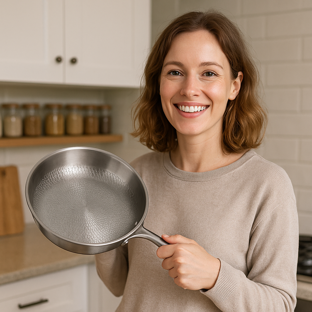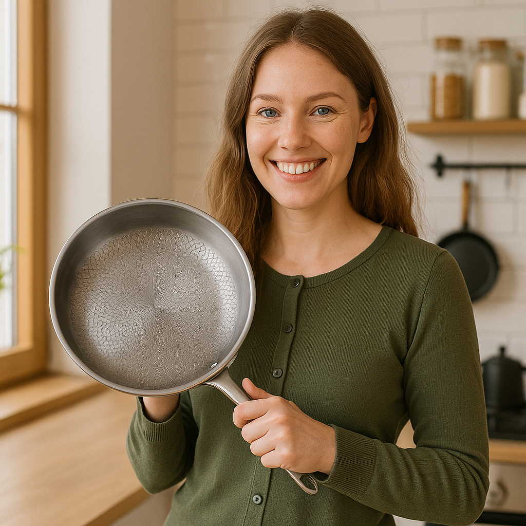 Stainless steel requires patience — and plenty of oil — to keep food from sticking. It can also react with acidic foods, leaving a metallic taste and reducing nutritional value. Over time, discoloration and stubborn stains build up, turning what was once a shiny surface into a constant cleaning battle.